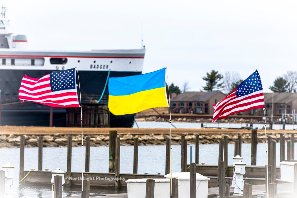 US and Ukrainian Flags flying in front of the Lake Michigan Car Ferry, SS Badger in Ludington Harbor. #2022PictureToday #Ludington #Michigan #Ukraine