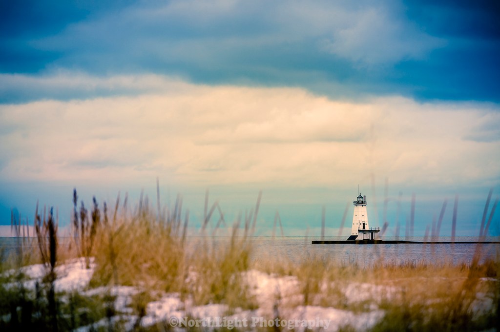View of the north break wall lighthouse channel marker as seen from Buttersville, Ludington, Michigan, USA.