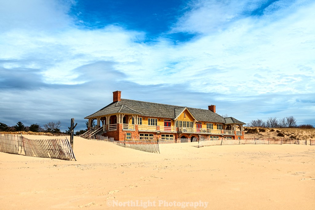 Winter wind blown dunes surround the Ludington State Park Beach House #pictureToday #Ludington #Michigan #USA.